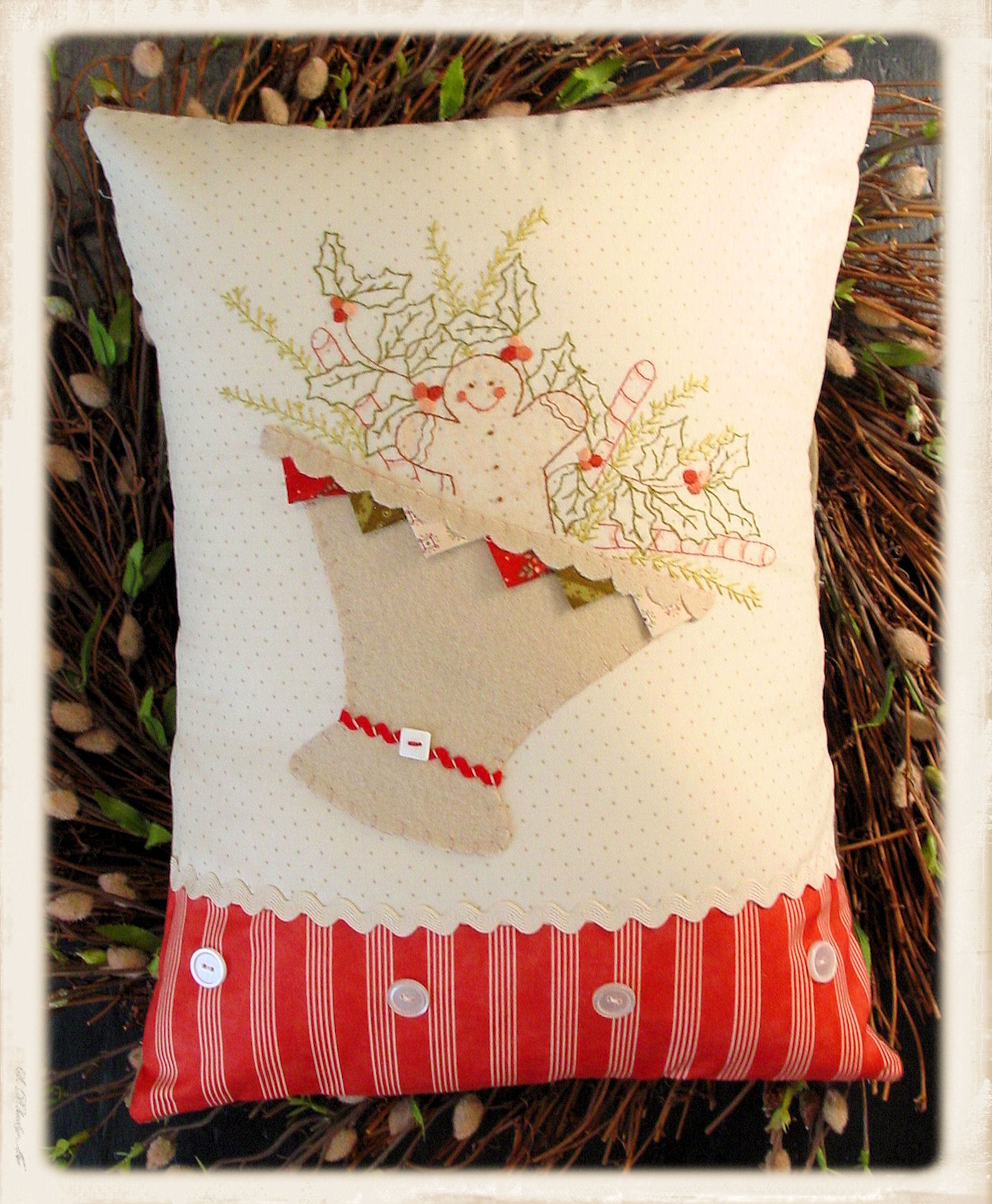 Embroidery, wool applique, prairie points, and crayon embellishment make this sweet holiday pillow.